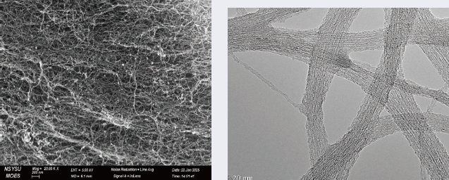 In 2024, single-wall carbon nanotubes (SWCNTs) were successfully developed. Under SEM, dense bundles of carbon nanotubes were observed, while TEM confirmed the single-layer nanotube structure, demonstrating the advantage of a high aspect ratio. Additionally, the carbon nanotubes exhibited excellent quality, with an IG/ID ratio greater than 30 in Raman analysis. Furthermore, the processes for purifying the carbon nanotubes and preparing carbon nanotube suspensions were established, with production scaling up from laboratory-level to pilot production line levels.