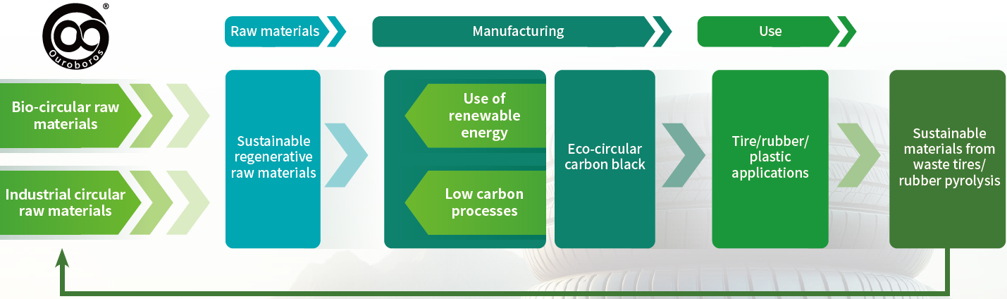 At the raw material stage, we introduce bio and industrial circular materials, and at the manufacturing stage, we use renewable energy. Through our decarbonization processes, we produce Eco-circular carbon black for downstream customers.