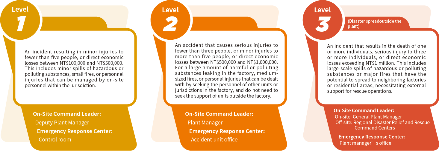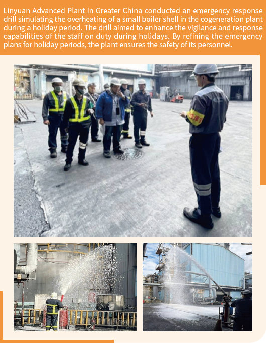 All operational plants have established emergency response plans. For instance, the Linyuan Advanced Plant in the Greater China, when an emergency incident occurs, the area supervisor is first notified. The supervisor then decides whether to form a response team and initiate a Level 1 incident response. If the situation cannot be controlled, it escalates to Level 2, at which point management takes command and notifies the fire brigade and other support units. If the incident escalates to Level 3, indicating an impact beyond the plant, a full emergency response plan is activated for real-time management. This involves collaboration between internal and external units to handle the crisis.