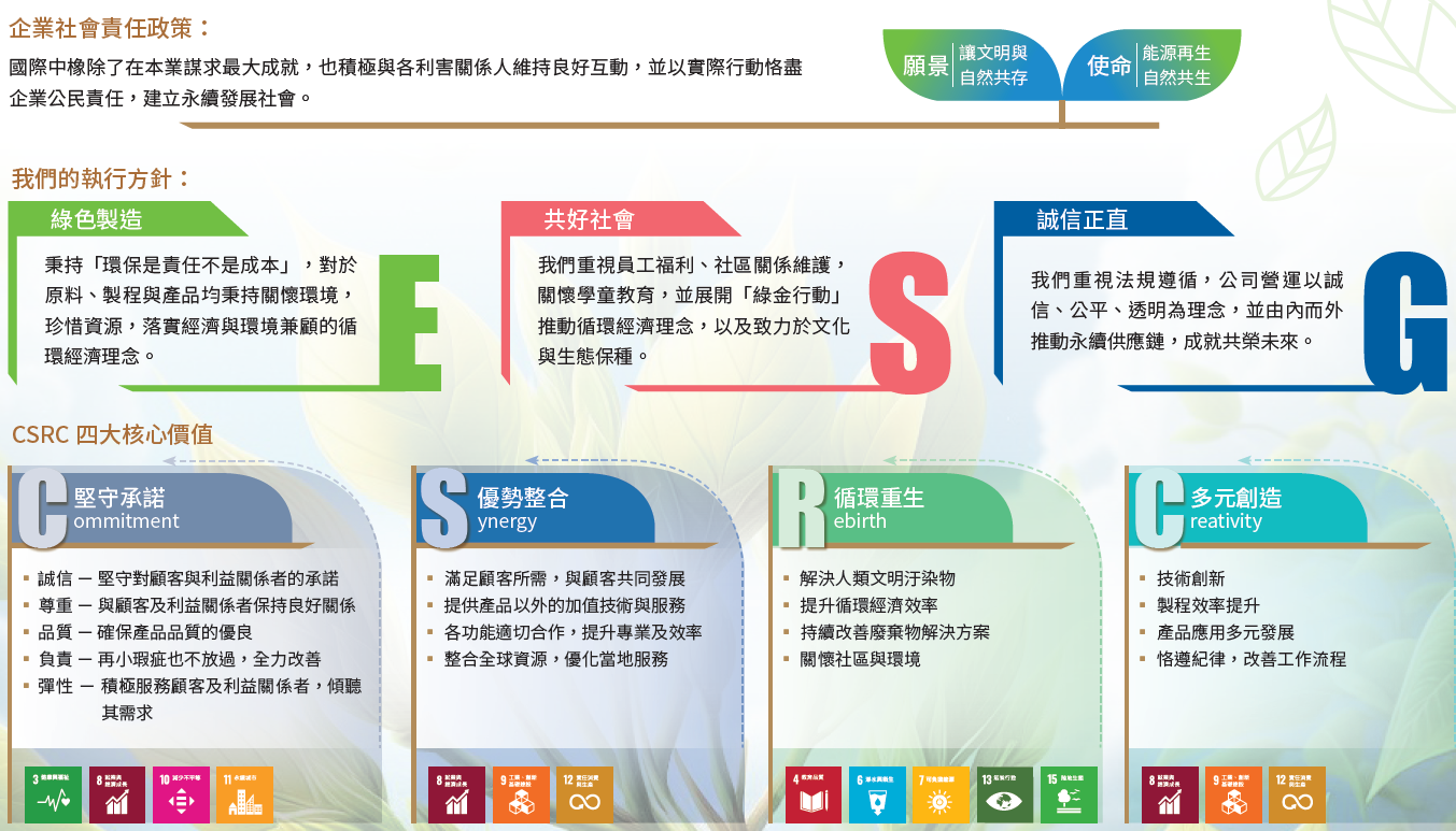 國際中橡為強化企業永續與公司經營的連結,於委員會下設誠信治理小組、循環製造小組、永續環境與產品小組、員工照顧小組、社會關懷小組,由各權責單位最高主管擔任小組成員,除委員及各小組組長例行與會外,每次會議召開得由主任委員依議案內容邀集小組成員參加,各小組應由小組組長選派幹事乙名,負責該小組職掌事項之聯繫溝通與協調,彙整該小組職掌相關資料之提供等事務。國際中橡並另制定《企業社會責任實務守則》、《公司治理實務守則》、《誠信經營守則》等規範,確保公司日常營運融入企業社會責任理念。