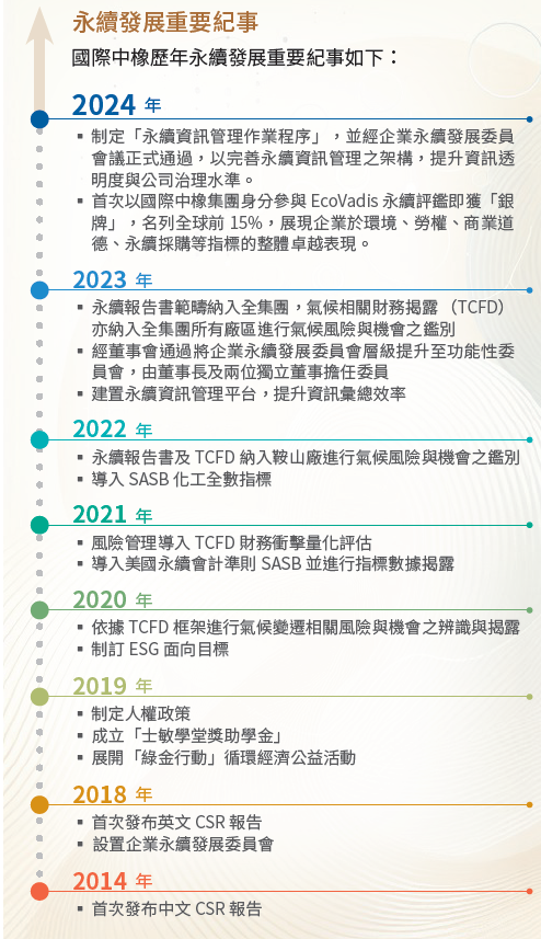 為確保企業永續行動之落實,國際中橡於 2018 年依《企業社會責任政策》設置企業永續發展委員會,並於 2023 年 12 月經董事會通過將企業永續發展委員會 (以下稱「委員會」) 層級提升至功能性委員會,由董事長及兩位獨立董事擔任委員。本委員會為提升公司永續經營之整體實踐,對外,委員會負責永續報告書的審核、辨識利害關係人所關注之永續議題;對內,負責擬定企業的永續政策、各功能群組關鍵績效指標、目標、計畫以及審核執行績效。委員會除定期運作外,並定期向董事會報告所制訂政策之目標規劃與執行情形。委員會以每半年召開一次為原則,必要時得彈性調整之,惟每年至少應召開一次。