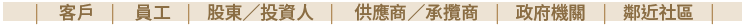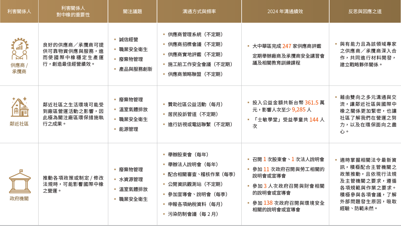 國際中橡依據 AA1000 SES 利害關係人議合原則(AA1000 Stakeholder Engagement Standard),進行利害關係人之辨識與特定主題之揭露,考量與公司日常作業具有經常性且重要性之外部個體,決定關鍵之利害關係人包含客戶、員工、股東/投資人、供應商/承攬商、政府機關、及鄰近社區等六大主要溝通對象。