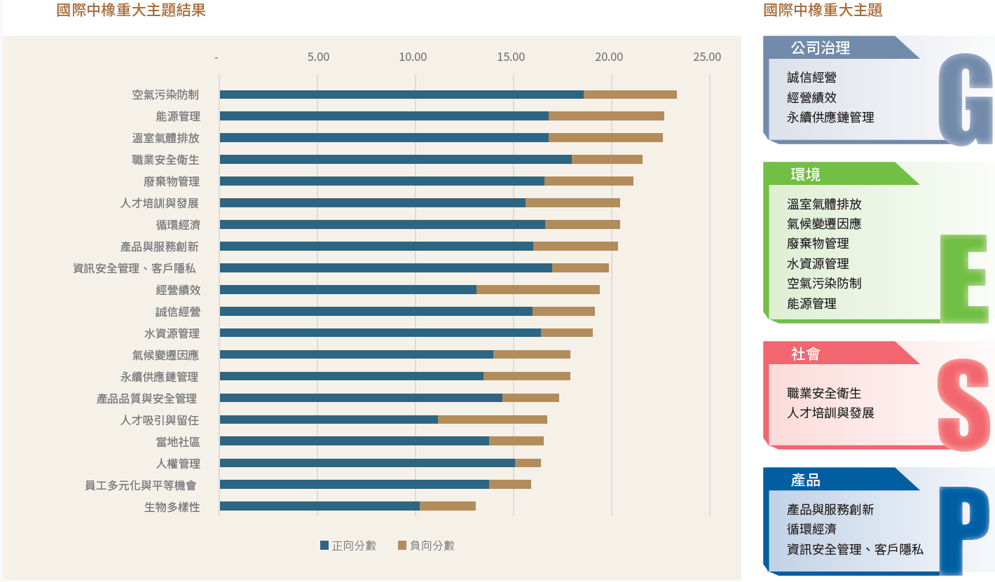 依據 GRI 2021 準則的重大性鑑別流程,透過鑑別、分析與確認等過程,從篩選出的 20 項關注的永續議題,最終收斂為 14 項重大主題,並據此擬定永續目標,透過內部績效指標檢核及同業績效比較,定期檢視相關執行及成效,強化管理與監督。因整體大環境方向趨同,且報告書範疇不變,故 2024 年延續國際中橡 2023 年進行的重大主題分析結果。