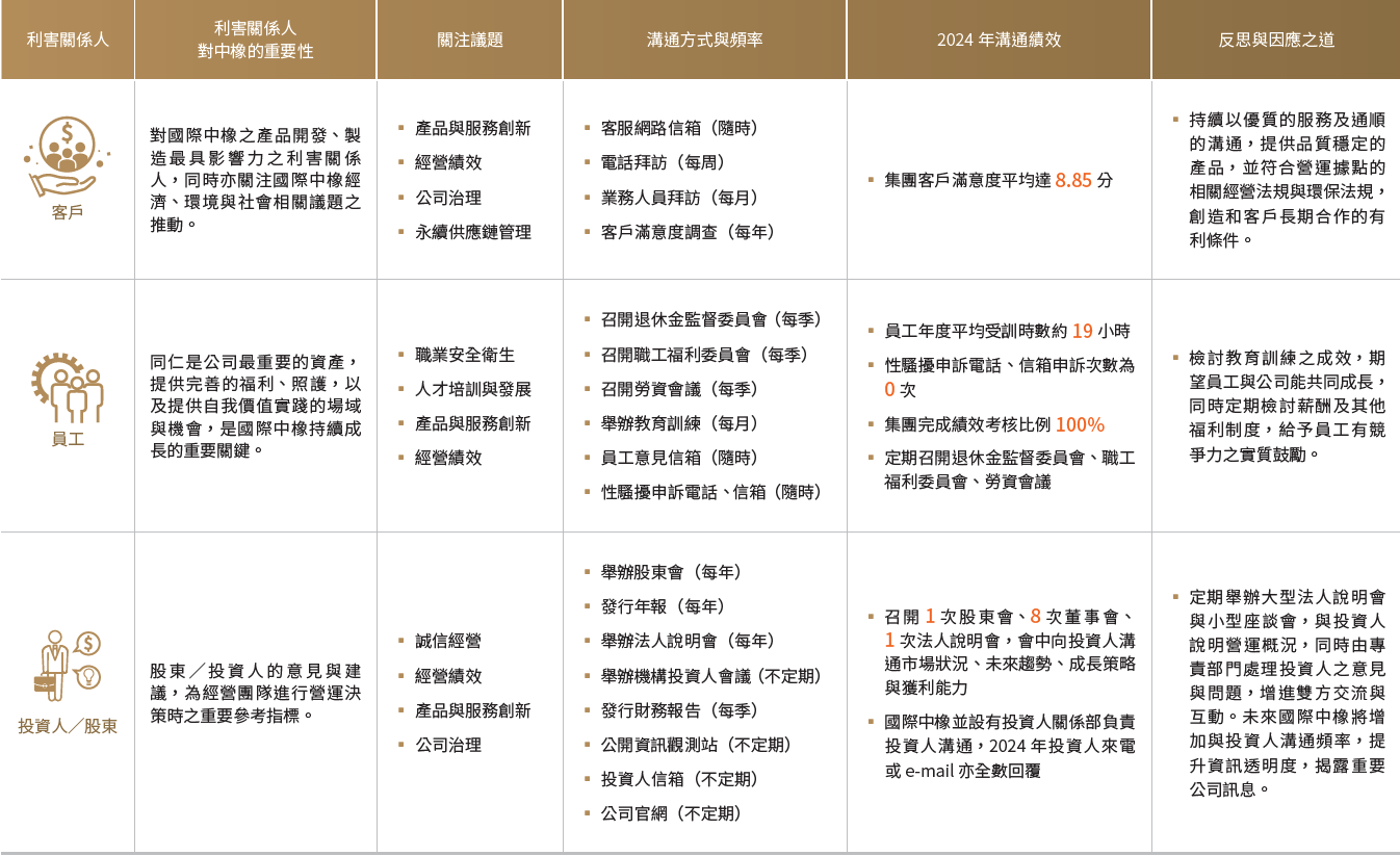 國際中橡以公開透明與多元溝通管道的方式揭露資訊,與利害關係人之溝通、相互交流,獲得資訊並給予回饋,確保雙方能有效且良好的溝通與對話。為使溝通及交流的成果得以累積並持續進展,設計了利害關係人溝通評估機制及關注議題管理程序,針對與利害關係人溝通的目的與成果加以評估,使來自不同利害關係人的意見均被妥善記錄管理,達成預計的溝通成效。