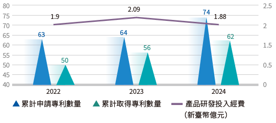 國際中橡研發團隊掌握全球趨勢,透過技術上的精益求精,以及設備與製程不斷的改善,與客戶共同於國際間屢屢展露卓越表現,並於大中華、印度、美國等地區擁有8 座碳黑生產工廠及4 座研發技服中心,致力開發更廣泛的碳黑應用,研究各式新型碳黑產品與各終端應用,以期成為世界級的碳黑製造與整合服務領導者,期許不斷地創新,並強化定位與競爭優勢。國際中橡碳黑事業群於 2024 年投入之研發費用達新台幣 1.88 億元;國際中橡累計取得專利數量達 62 件。
