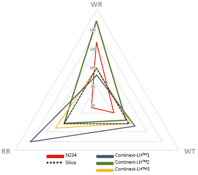優異的輪胎需具備「魔鬼三角定律」,包含「滾動阻力(rolling resistance, RR)」、「抗濕滑性能 (wet traction, WT)」、「耐磨性能 (wear resistance, WR)」,新型 LH 系列碳黑 (Continext-LH ™) 在滾動阻力 (RR)、耐磨性能 (WR) 表現上具有顯著優勢。