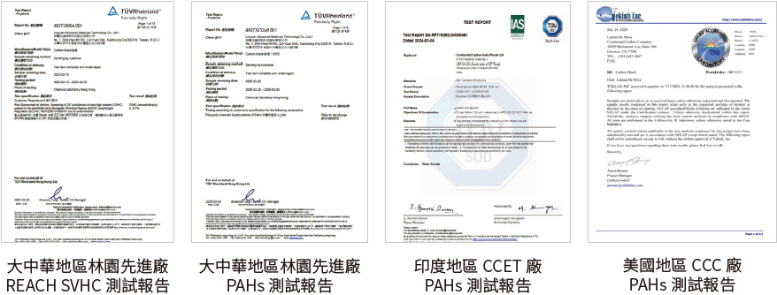 橡膠、塑料(如ABS、PP)和天然材料上的透明漆、塗層等都可能含有多環芳香烴(PAHs)等高危害材料,且經研究發現PAHs 對人體的主要危害部位是呼吸道和皮膚,屬於持久性有機污染物,已被國際癌症研究中心列為致癌物。有鑑於此,我們致力於降低碳黑中 PAHs 含量,符合德國產品安全委員會(AfPS)之安全標準(German Safety, GS)第二類之要求,並且每年度透過碳黑PAHs 限制量以及含量檢測,讓客戶得以安心購買與使用。 2024 年大中華地區林園先進廠危害物質檢測通過 264 項;美國地區六種碳黑產品各自通過了 17 項關於多環芳香烴(PAHs)和可萃取物的測試,共 102 項;印度地區 CCET 廠通過了 240 種符合 SVHC(高度關注物質)的物質,以及 30 種符合 RoHS(有害物質限制指令)的物質測試。而 CCIPL 廠則通過 228 種符合 SVHC 的物質,以及 30 種符合 RoHS 的物質測試,檢驗產品合格率皆達 100%。