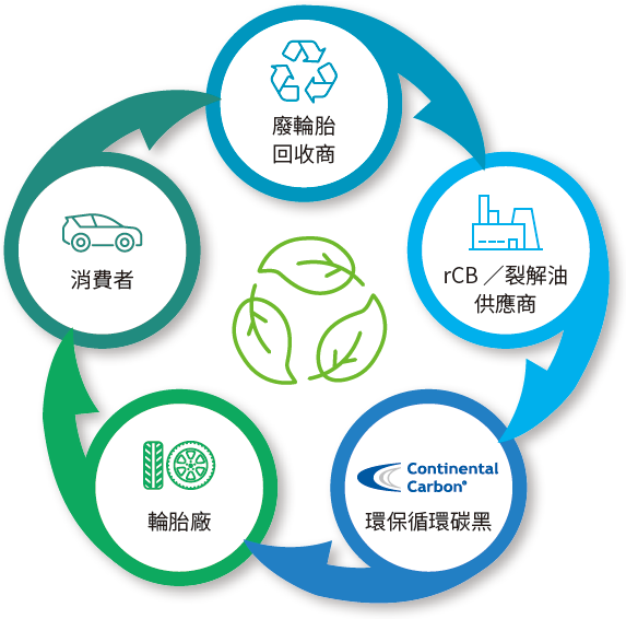 公司持續投資於技術研發,探索使用各種可持續/ 再生原料和能源,優化生產過程,提高能源利用效率,生產出適用於不同需求的穩定高品質「環保循環碳黑」。透過專業品質控管,除了保證使用低碳產品的輪胎品質不受影響,加上先進的生產和調配技術,確保環保循環碳黑的物理特性能與原生碳黑相匹配,減少輪胎橡膠配方的變動。為了達到客戶減碳目標,我們配合輪胎下游客戶的開發需求,合作開發符合循環經濟需求又達到減碳的產品。