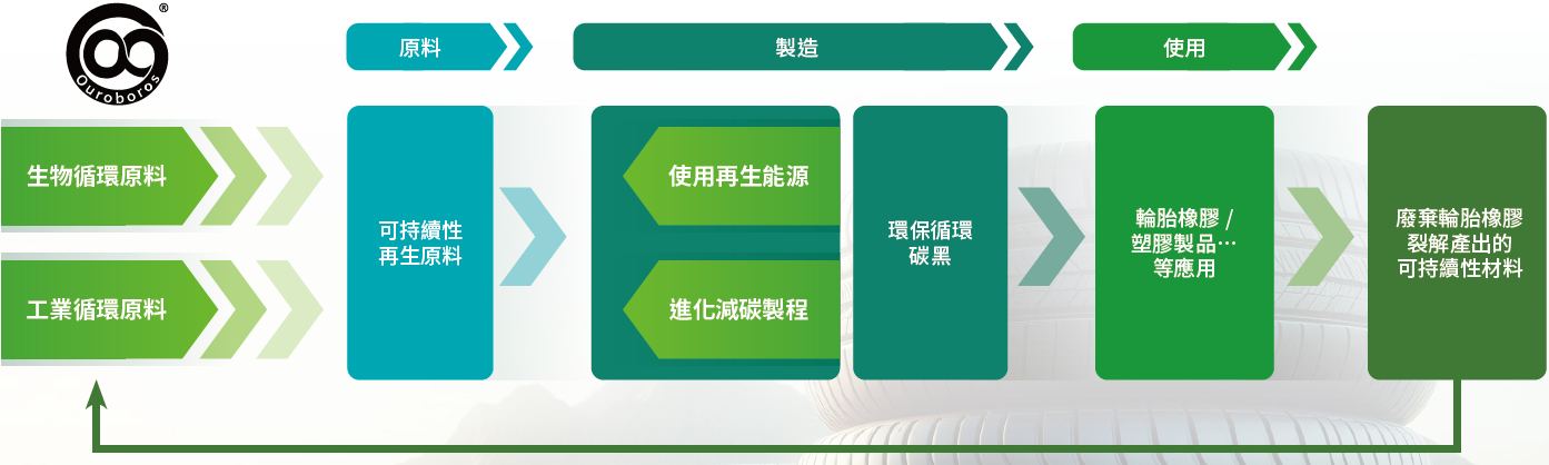 於原料端導入生質原料及工業循環原料,並於製造端使用再生能源,透過我們的減碳製程,製造出環保循環碳黑,提供給下游客戶使用。