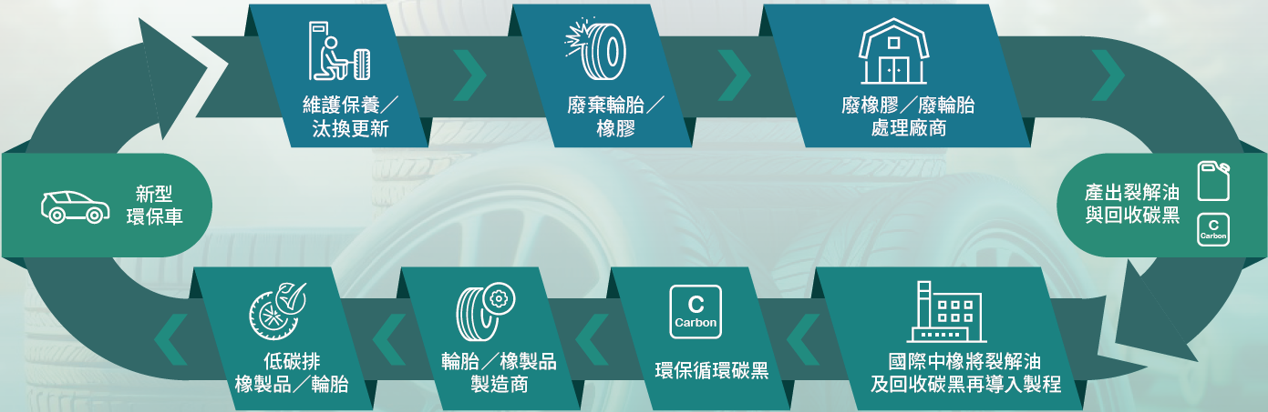 國際中橡在「循環經濟」的道路上精益求精,於原本循環經濟路徑進行優化升級,從工業及生物循環的可持續性、再生原料,以及促成再生循環減碳的技術研發與製程優化,以多管齊下方式升級循環經濟的實踐路徑,以達成降低碳排目標。