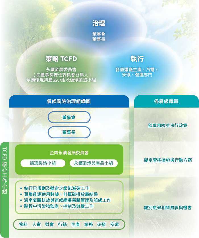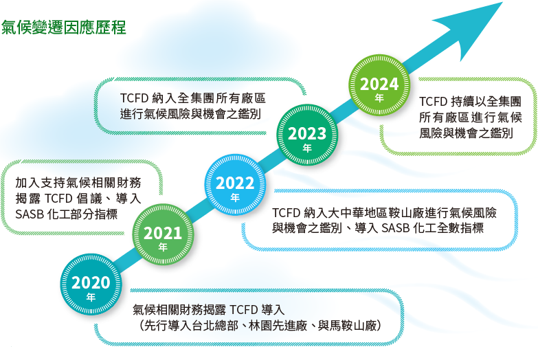 台灣政府於 2022 年正式公布「臺灣 2050 淨零排放路徑及策略」,亦於 2025 年公布台灣 NDC3.0 的「Beta 版」2030 年國家溫室氣體淨排放量減碳目標較 2005 年減少 28±2%、2035 年目標較 2005 年減少 38±2%。考量國內外溫室氣體排放法規逐漸嚴格,以及極端氣候帶來的天災可能對營運場所造成直接衝擊,以上轉型或實體氣候相關風險皆會對公司財務造成影響。國際中橡自 2020 年起依據氣候相關財務揭露建議 (Task Force on Climate-related Financial Disclosures, TCFD),透過專案會議討論、積極執行風險與機會之辨識,並設置氣候變遷因應目標以逐步減緩相關風險影響程度。國際中橡亦逐年擴大範疇,於 2023 年已納入全集團生產據點,以下廠區 [包括大中華地區( 台北總部、林園先進廠、協原化學、馬鞍山廠、鞍山廠、重慶廠)、印度地區 (CCET 廠、CCIPL 廠)、美國地區 (Ponca 廠、Sunray 廠)] 皆100% 辨別氣候風險與機會之鑑別,公開支持國際 TCFD 倡議、導入 SASB 化工行業全數指標,並完成簽署 TCFD。