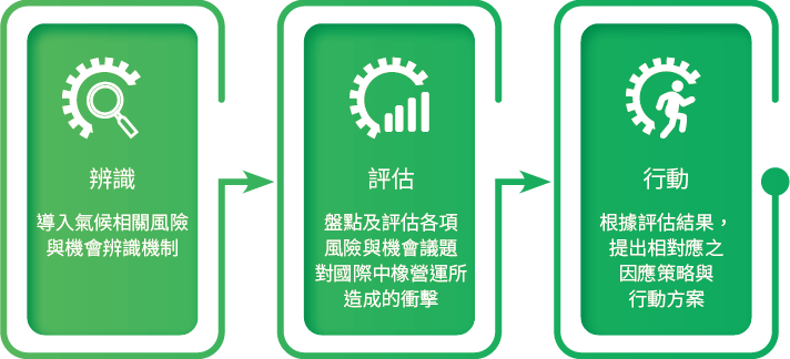 國際中橡對於氣候相關風險與機會之策略包含「辨識」、「評估」、「行動」三大程序,導入氣候相關風險與機會的辨識機制,充分盤點及評估各項風險與機會議題對國際中橡營運所造成的衝擊並進行管理,2024 年依循相同架構更新其盤點及評估氣候相關之風險與機會。