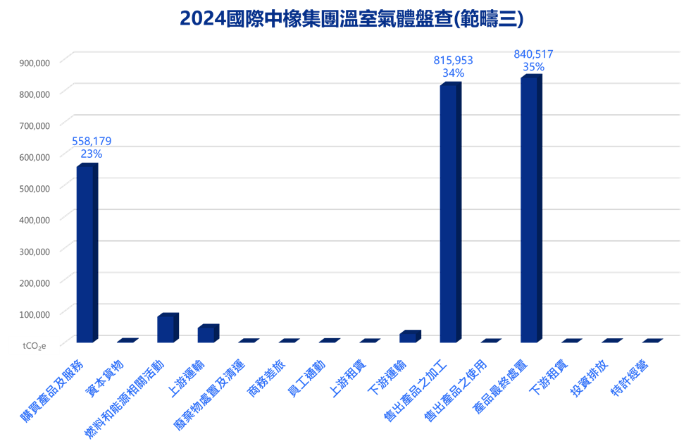 目前集團已經遵循 GHG Protocol 原則,針對範疇三之項目進行碳盤查,結果如下表。2024 年範疇三總碳排量為 2,376,109 噸,大中華區(含總部)占比為 37.4%,印度區占比為 33.2%,美國區占比為 29.4%。未來集團將持續進行產線技術改造及製程優化,以降低油單耗並提高能源利用率,以降低顯著項目之碳排放。